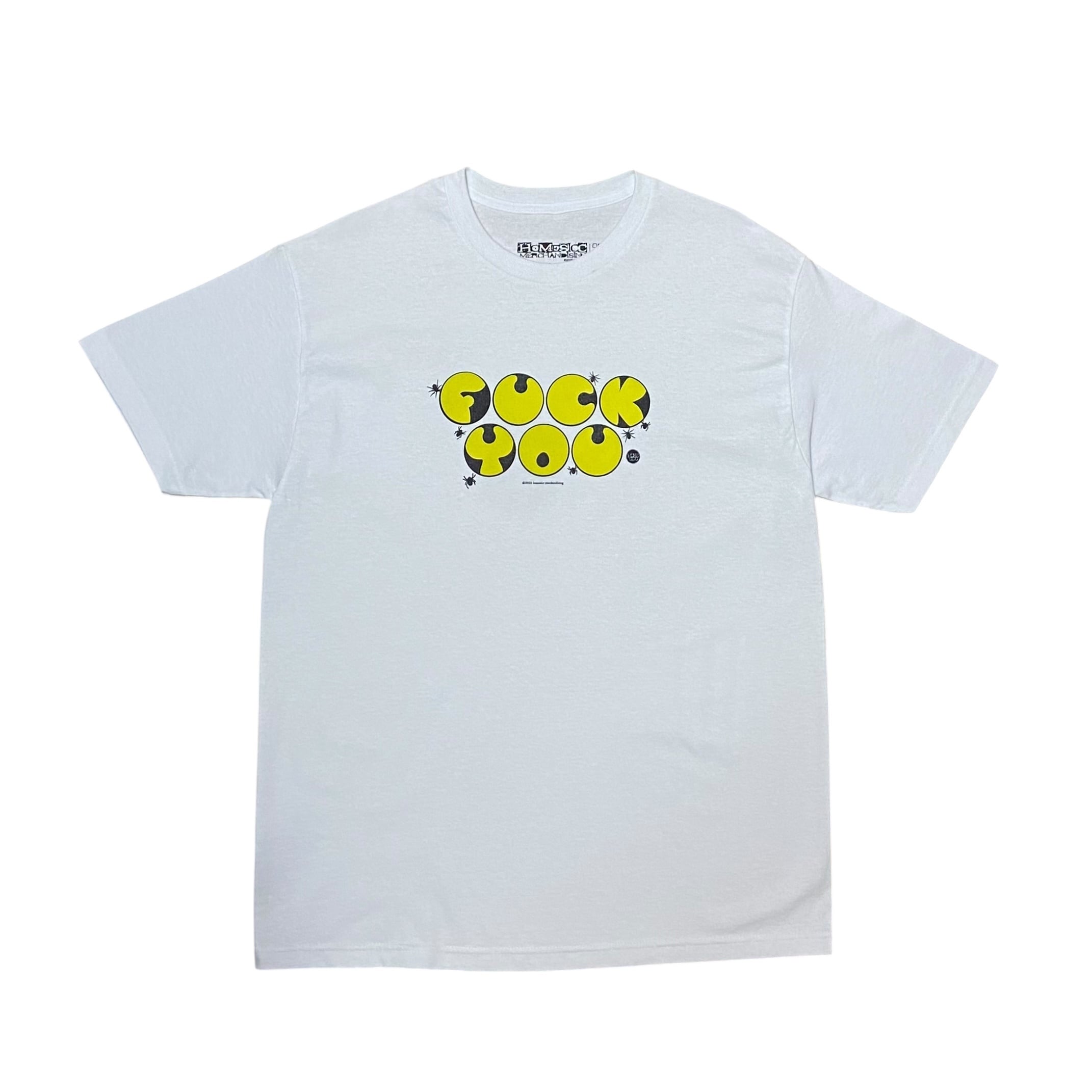 -丸い"f**k you"の文字の周りに蜘蛛を散りばめたデザイン。