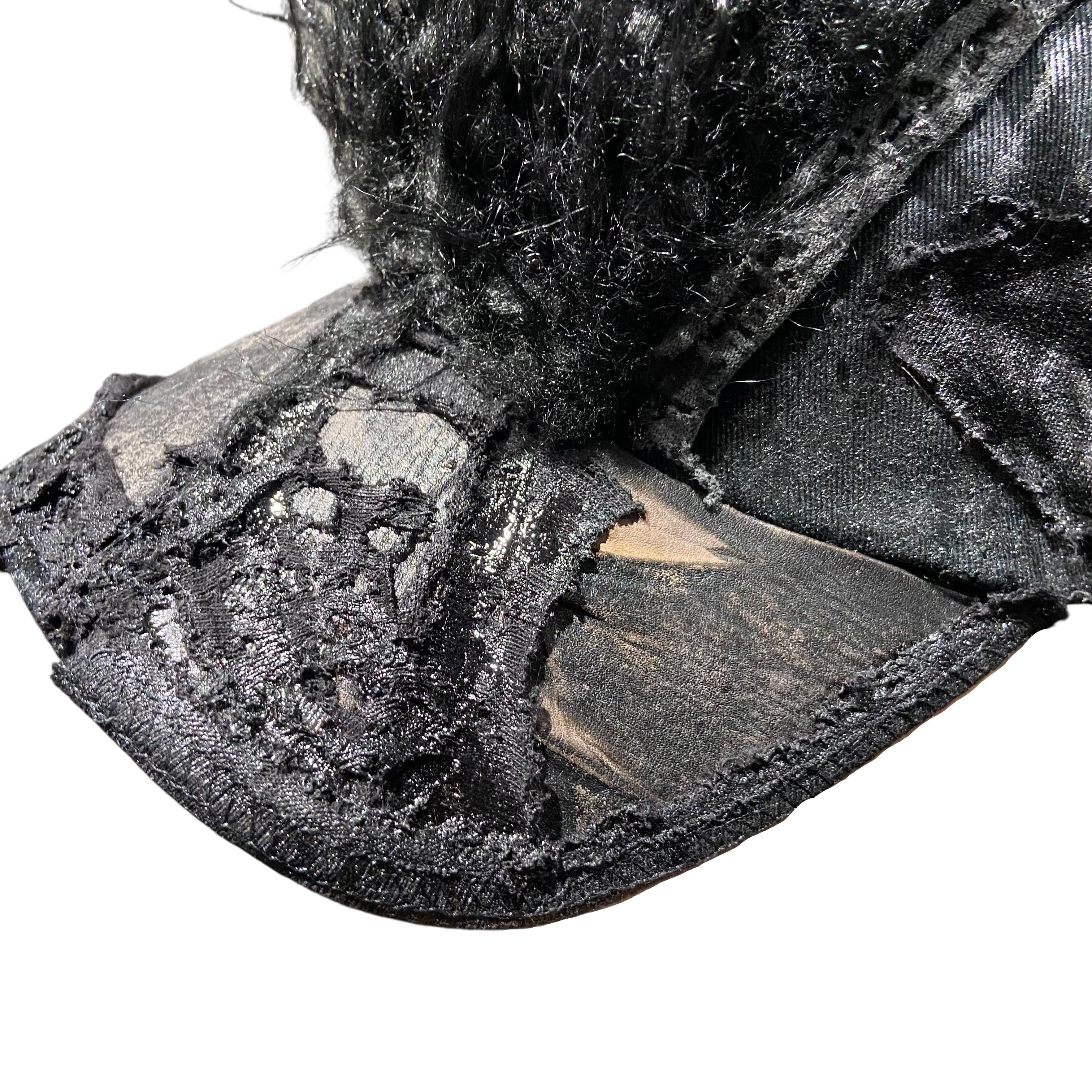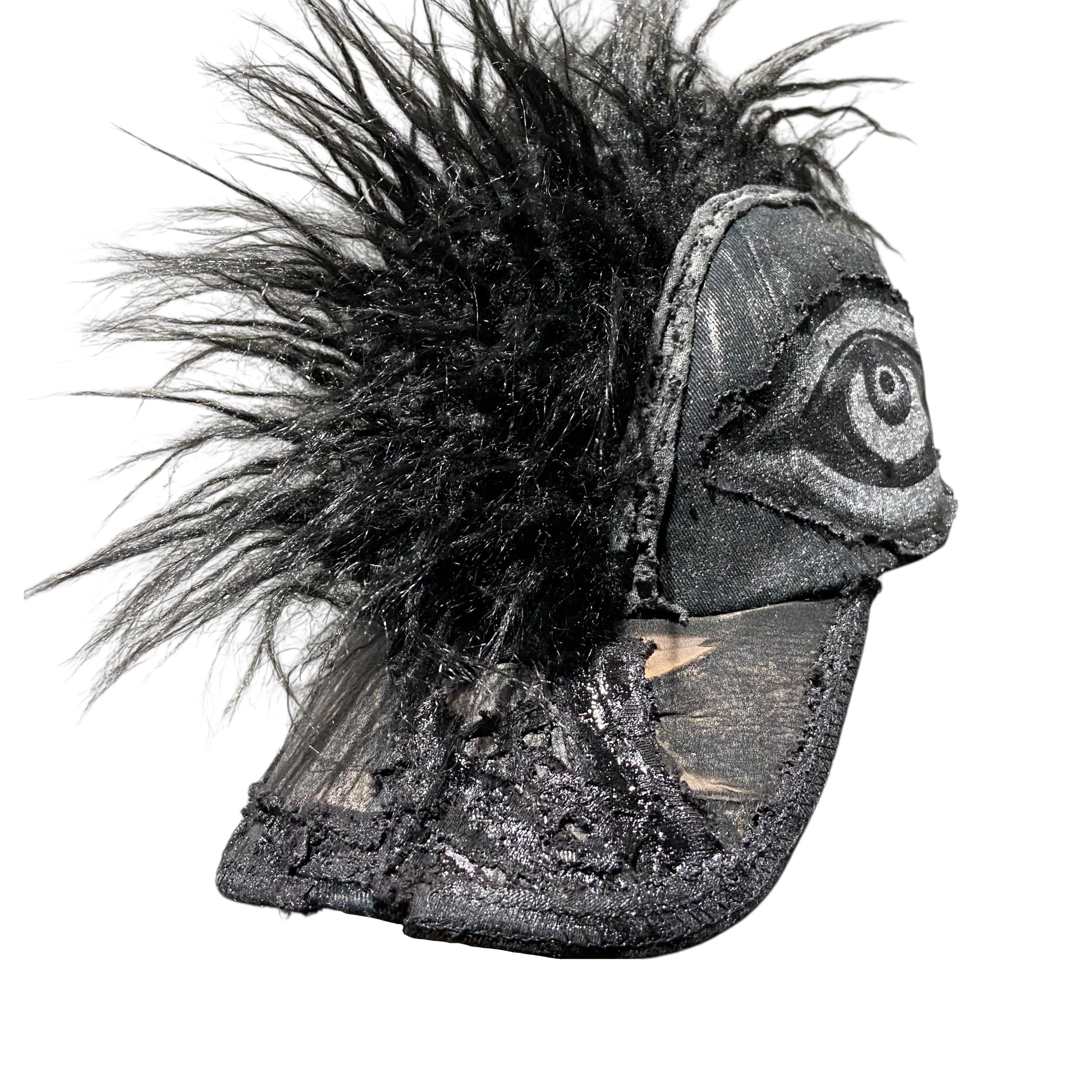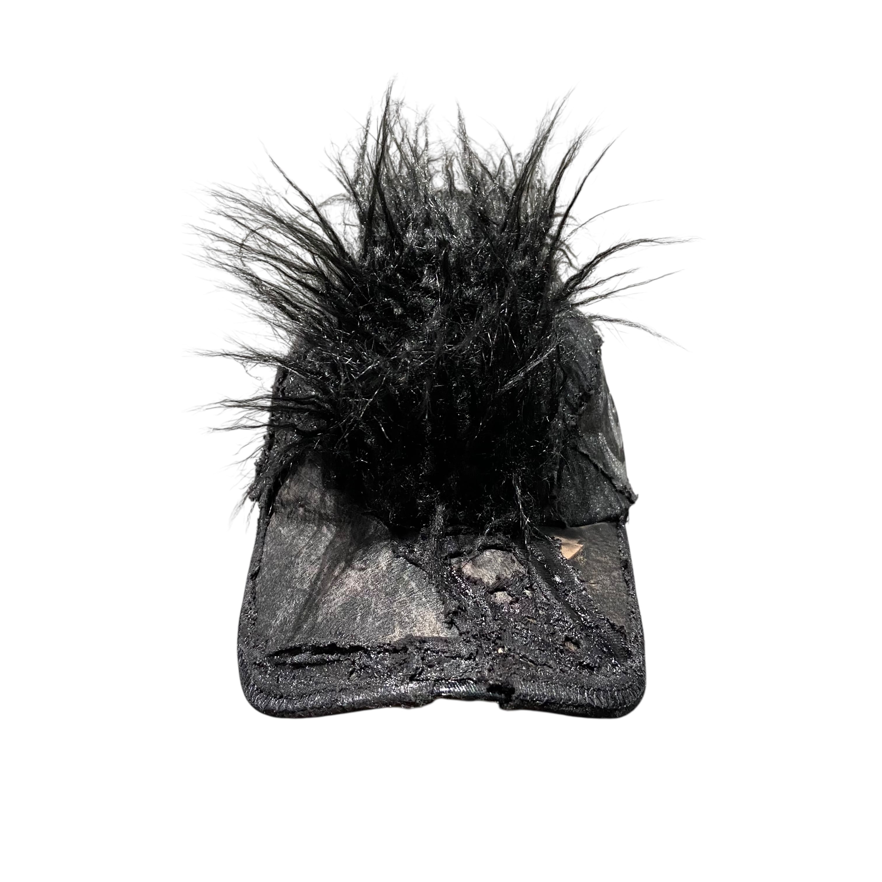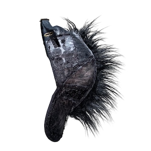 -全て手作業で加工された一点物。 売り切れ次第販売終了。 -中央に毛足の長いチベットラムフェイクファーを取り付け。 -パネル/バイザーの装飾にはポニーレザー(本革)を採用。 -シルクスクリーンプリントのパッチを取り付け。 -全体に奥行きのあるテクスチャのハンドペイント。 -ボディは芯なしの6パネルトラッカーハット。 color : black × gray size : one size fits all