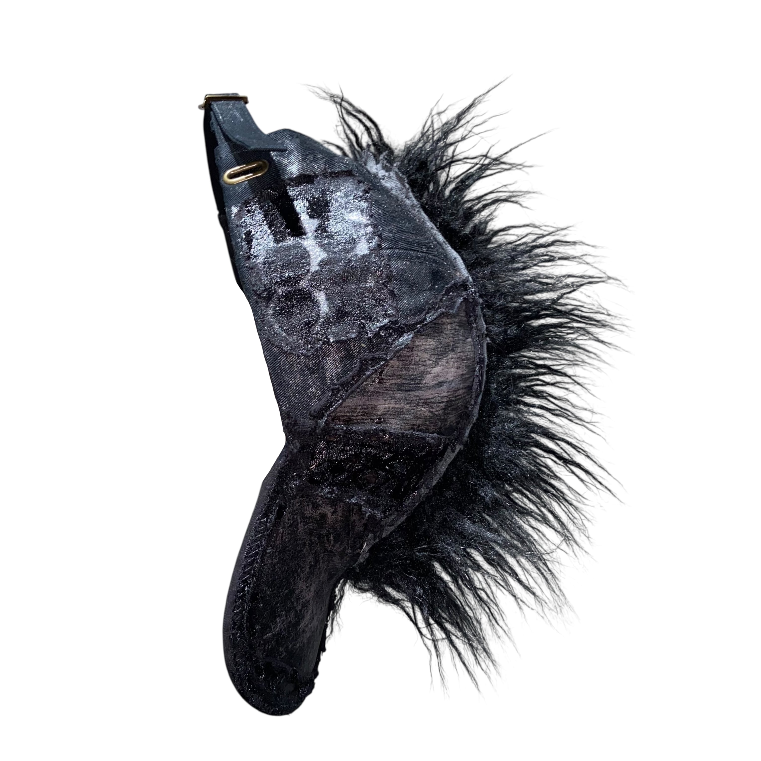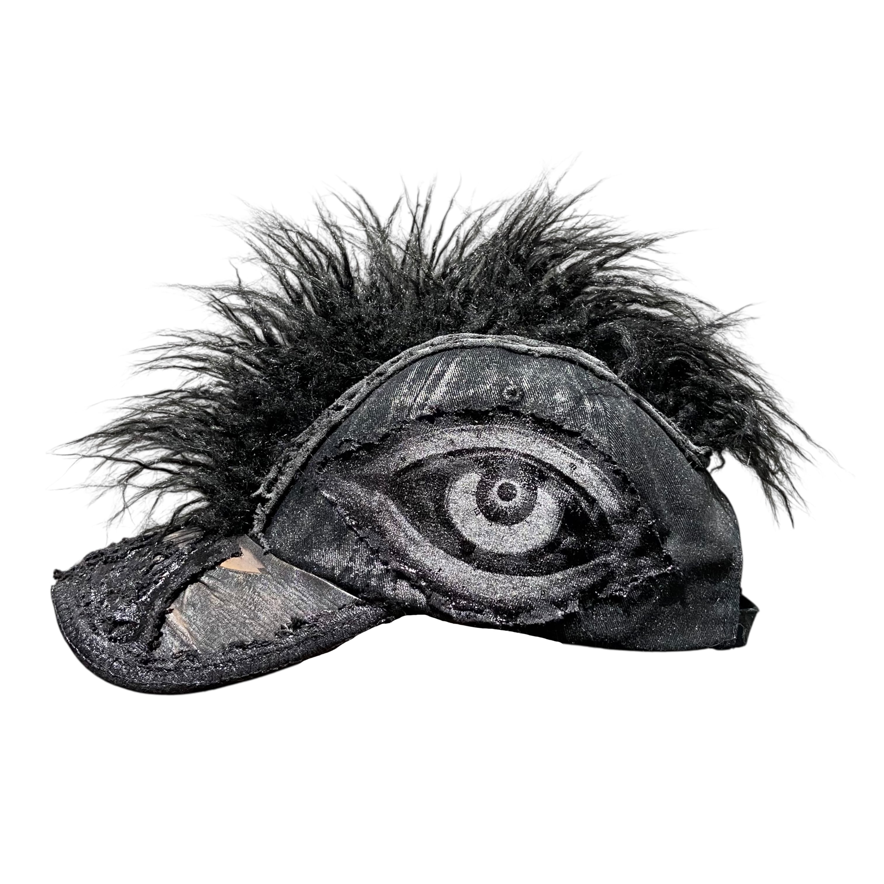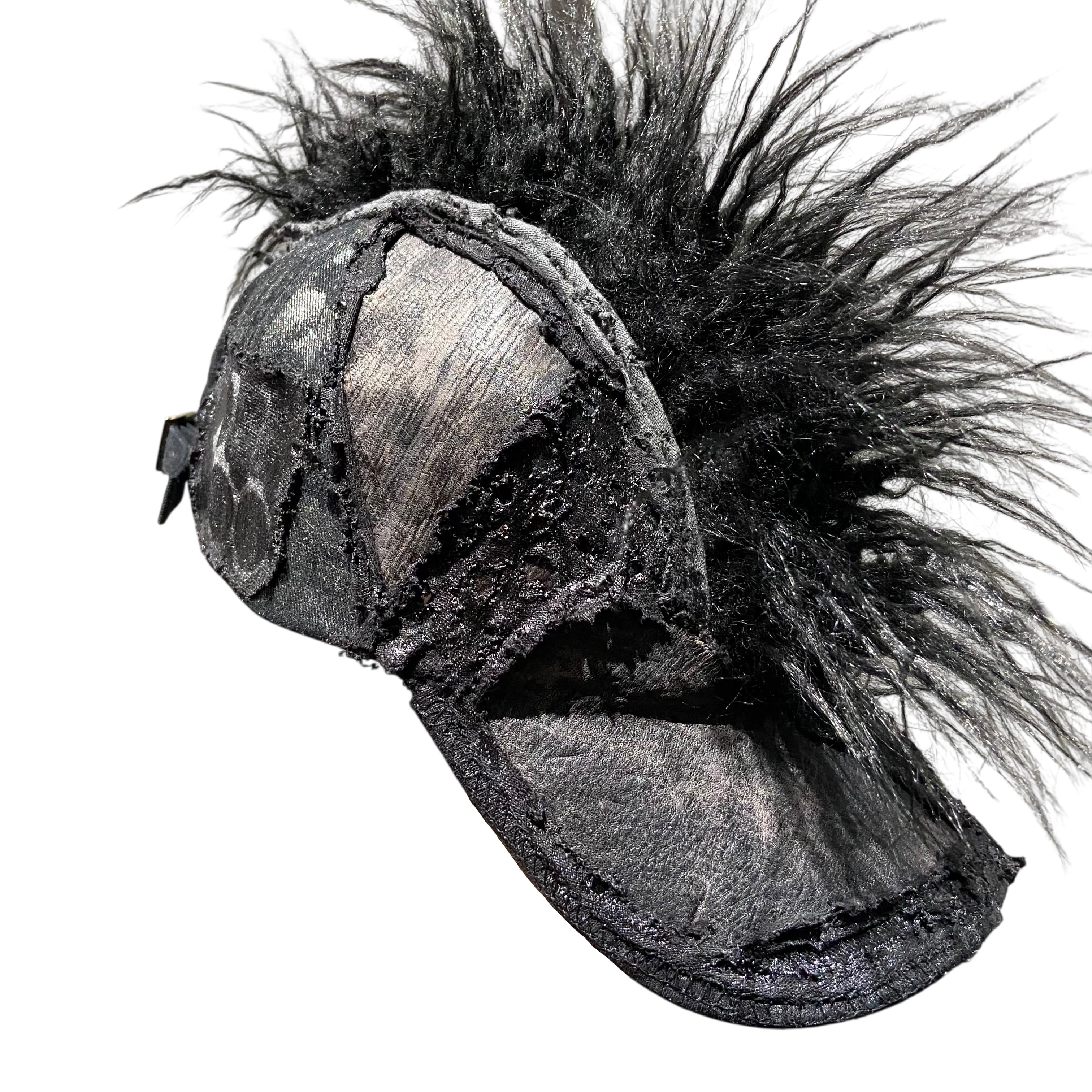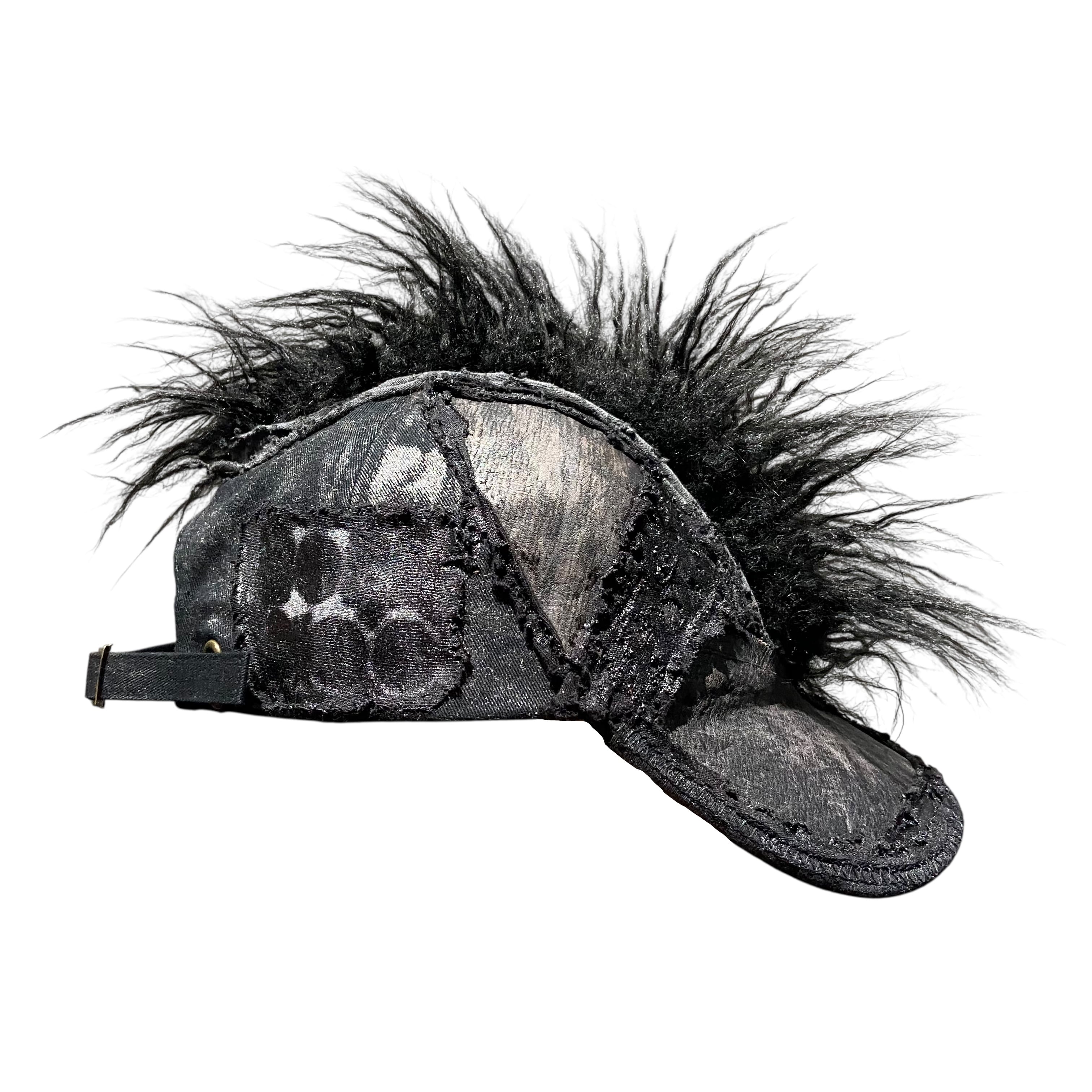 -全て手作業で加工された一点物。 売り切れ次第販売終了。 -中央に毛足の長いチベットラムフェイクファーを取り付け。 -パネル/バイザーの装飾にはポニーレザー(本革)を採用。 -シルクスクリーンプリントのパッチを取り付け。 -全体に奥行きのあるテクスチャのハンドペイント。 -ボディは芯なしの6パネルトラッカーハット。 color : black × gray size : one size fits all